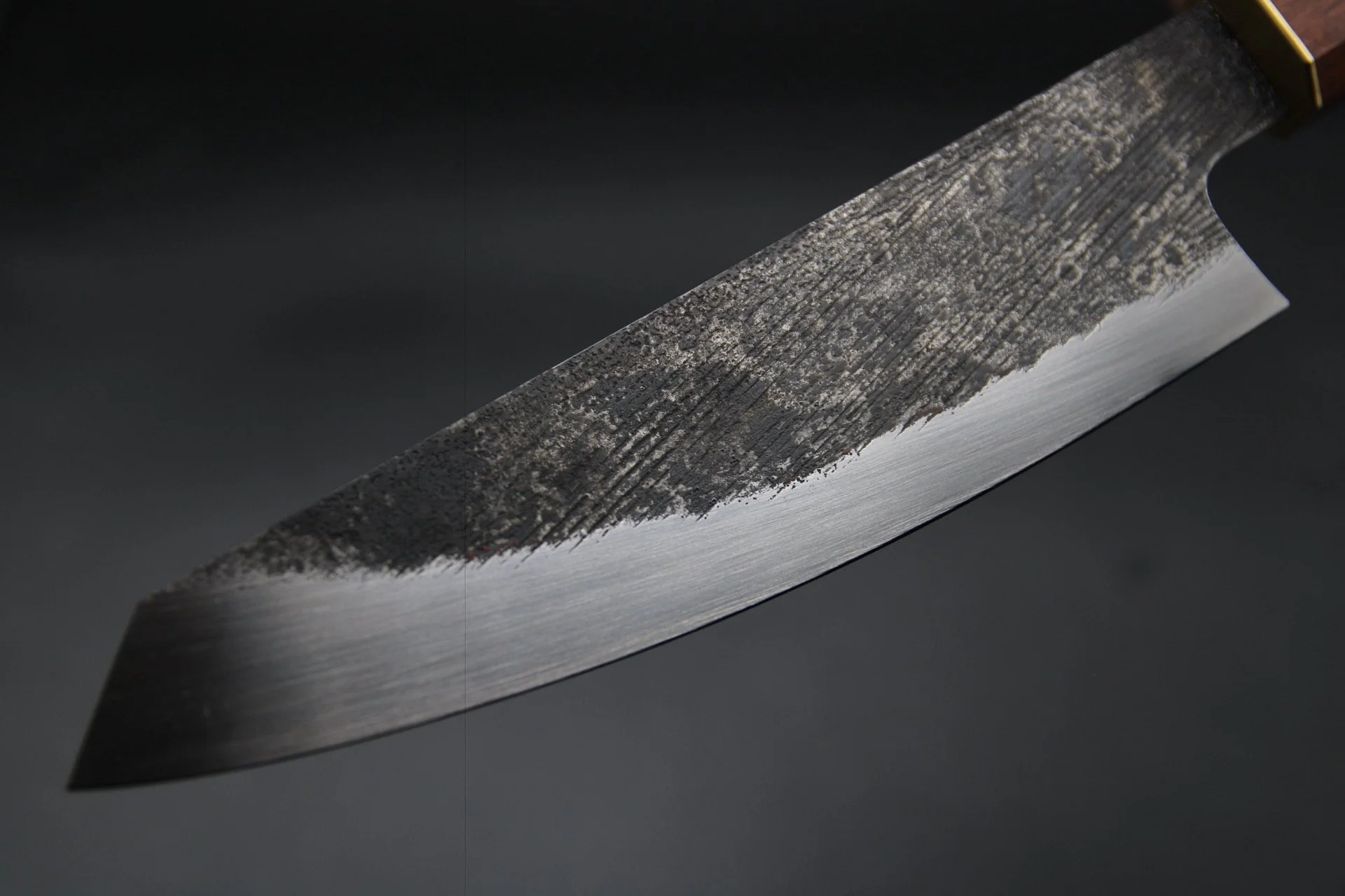 — Un acier carbone : C125U/C130. Un acier faiblement allié, avec un taux élevé de carbone (1,25%), j’affectionne particulièrement cet acier par sa pureté et par les possibilités qu’il offre à la coutellerie de cuisine. De par son taux élevé de carbone, il permet d’atteindre après trempe des duretés très élevées (jusqu’à 64HRC), ce qui est fondamental pour le tranchant d’un couteau de cuisine performant. Son faible alliage permet, quant à lui, un aiguisage facile sur pierre à eau, et des jolies lignes de trempe (Hamon).