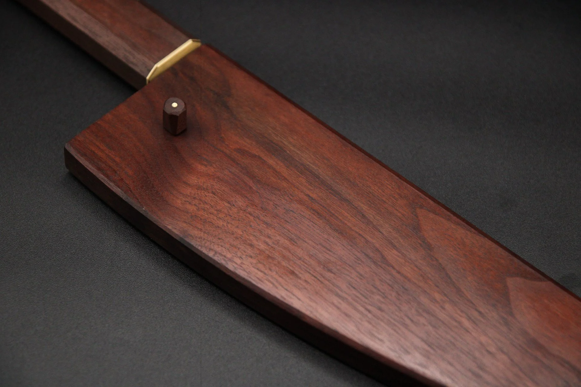En ce qui concerne les matériaux du manche et des fourreaux, je travaille essentiellement avec du noyer, car j’ai récupéré un grand stock d’un noyer d’Amérique que je trouve magnifique. Je le travaille au naturel, sans stabilisation ni produits chimiques. Je me contente d’appliquer, en plusieurs couches, l’huile naturelle de Tung - une huile utilisée depuis plusieurs siècles pour ses capacités à protéger le bois de l’humidité et des tâches, tout en gardant les tanins naturels des essences.